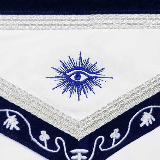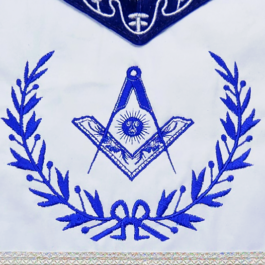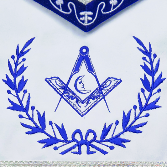 Blue Lodge Tyler Apron – Masonic Officer Regalia with Machine Embroidered Wreath & Square – White Embroidered Detailing on Deep Blue Velvet