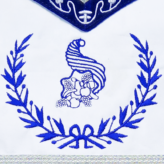 Blue Lodge Senior Steward Apron – Masonic Officer Regalia with Machine Embroidered Wreath & Cornucopia – Royal Blue Ribbon Detailing