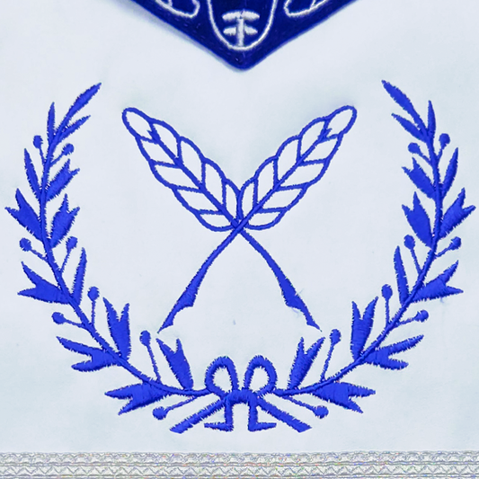 Blue Lodge Secretary Apron – Masonic Officer Regalia with Machine Embroidered Wreath & Quill Pens – Royal Blue Ribbon Detailing