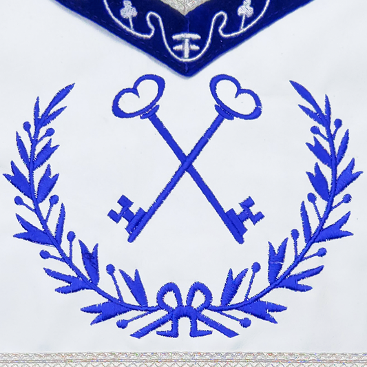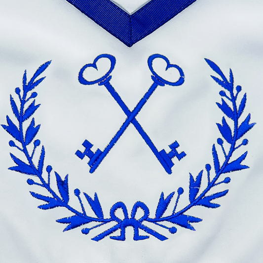 Blue Lodge Treasurer Apron – Masonic Officer Regalia with Machine Embroidered Wreath & Crossed Keys – Royal Blue Ribbon Detailing