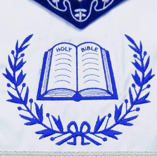 Blue Lodge Chaplain Apron – Masonic Officer Regalia with Machine Embroidered Wreath & Opened Holy Book – Royal Blue Ribbon Detailing